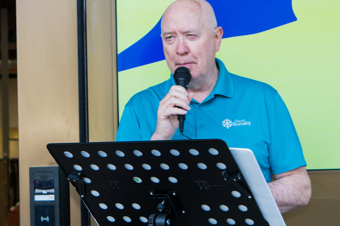 Burnaby Mayor Mike Hurley (left, or top on mobile device) and CEO & Chief Paddle Officer Chris White (right, or bottom on mobile device) addressing the attendees prior to the ribbon cutting (Click photos to enlarge.)